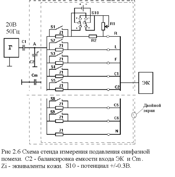 испытательный стенд, представленный на рис 2.5, имеют эквиваленты кожи по каждому электроду, которые поочередно отключают для имитации изменения Rкожи. В цепи электрода N эквивалент кожи не отключают.
