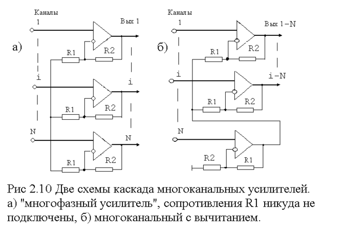 Многоканальные усилители строятся как наборы каналов по схемам рис 2.8, так и с использованием особых многоканальных схем. Структура такого многоканального усилителя приведена на рис 2.9а,б.