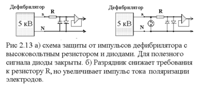 а рис 2.12 приведены два варианта схем защиты от дефибрилятора и разрядов статического электричества. На входе усилителя устанавливаются защитные резисторы и диоды, которые ограничивают импульсы. Резисторы должны быть высоковольтные. Что бы снизить требования к резисторам, во второй схеме на входе установлен разрядник. Он снижает амплитуду входных импульсов до величины 100-200В.