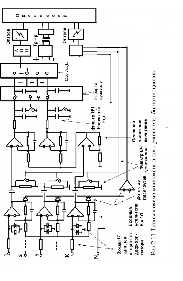 етрудно видеть, что разнообразие требуемых функций оставляет простор для инженерной мысли, однако нет сомнения, что со временем УБС станет типовым узлом - микросхемой. Для примера на рис 2.10 представлена обобщенная полная схема усилителя биосигналов N канального энцефалографа. В таблице 2.3 приведены типовые параметры современного усилителя биосигналов.