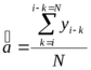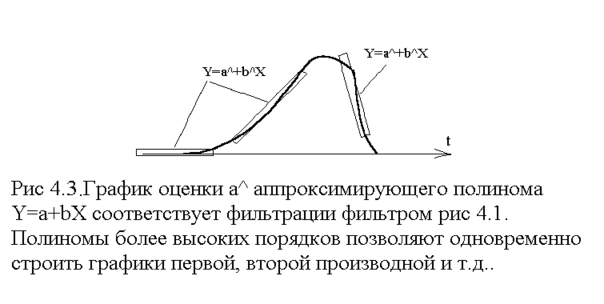 Работу фильтра с прямоугольным откликом можно так же представлять как нахождение наименее уклоняющейся оценки коэффициента а^ интерполирующего полинома у=(а + бх) на скользящем интервале (см рис П.7.4). Оценка находится по формуле