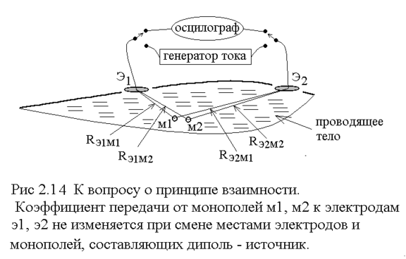 Принцип взаимности утверждает: коэффициент передачи потенциала от дипольного источника к приемным электродам не изменяется, если заряды излучающего диполя и приемные электроды поменяем местами, как показано на рис П.6.1 Действительно, пусть мы имеем диполь и биполярное отведение. Диполь представим как пару монополей: в этом случае принимаемое электродом "к" поле выражается как Uк=Е/Rк, где Rк- расстояние до к-го электрода. Заряды диполя расположены в точках 1м, 2м, а приемные электроды в точках 1э, 2э. Электродное отведение