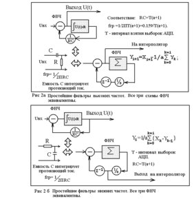 Это фильтры с обратными связями. Фильтры первого порядка показаны на рис П.7.5. П.7.6 Они соответствубт фильтрам Батерворда первого порядка. Его отклик и частотные характеристики соответствуют таковым у RC цепочки с постоянной времени τRC=Ткв(а+1) (1/а - величина ослабления сигнала в цепи обратной связи при рекурсивном суммировании). Алгебраическая запись