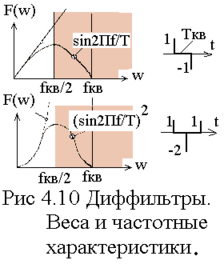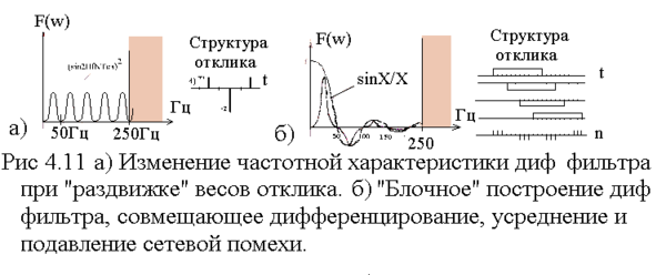 Процедуру (1) так же можно называть дважды дифференцирующим фильтром (сокращенно 2диф фильтром) с весовой функцией -1,+2,-1 (показана на рис П.7.12). Частотная характеристика 2диф фильтра показана там же. В спектральной области частотная характеристика выглядит как Ф(w)=w2 (при области существования w < Fкв/2). Соответственно резко подчеркиваются высокочастотные составляющие шумов. При весовой функции (пусть отсчеты независимы) увеличение дисперсии шумов равно 4 для 2 диф фильтра.