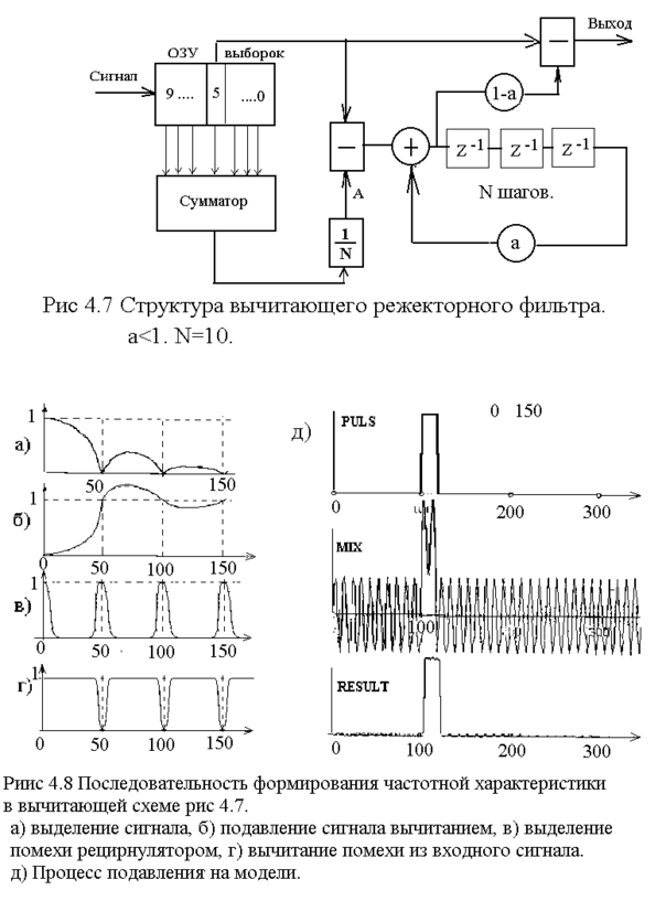 ругой тип вырезающего режекторного фильтра использует вычитание помехи. Рассмотрим "вычитающий" фильтр с использованием накопителя помехи типа "рециркулятор".