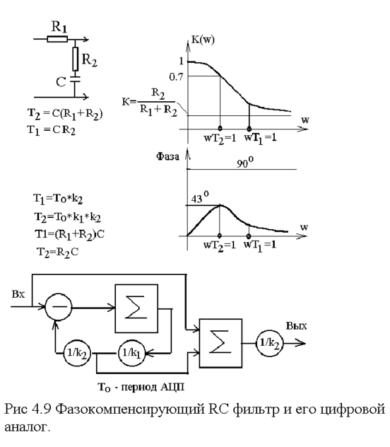 . Сразу видно, что если потребовать равенства T=T1 и умножить числитель и знаменатель на Т2, то после сокращения постоянная времени Т1 исчезает и суммарный фильтр получает постоянную времени Т2. Таким образом подключая фазокомпенсирующий фильтр мы изменили постоянную времени исходного ФНЧ (а следовательно и частоту среза) от Т1 к Т2. То же относится и к ФВЧ. Особенно удобно фазокомпенсирующий фильтр выполнять в цифровом виде. Тогда оказывается возможно програмно изменять постоянную времени физического CR фильтра, установленную в первых каскадах усиления. Особенно это удобно, когда надо получать очень низкие частоты среза, например 0.05Гц в электрокардиографии. Физический фильтр устанавливается с постоянной времени 0.3 с и с помощью цифрового фазокомпенсирующего его постоянная времени увеличивается до 3с. При этом время выхода из перегрузок остается в соответствии с физической постоянной времени 0.3с, т.е. небольшим.