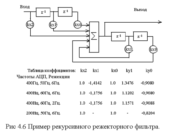 Структура фильтра представлена на рис П.7.9 Преобразование его частотных характеристик на рис П.7.10. Первое звено обеспечивает подавление полезного сигнала и выделение чистой сетевой помехи. Второе звено накапливает сетевую помеху, окончательно уничтожая остатки сигнала и подавляя гауссовы шумы. Наконец, очищенная сетевая помеха вычитается из входного сигнала. На рис П.7.10д представлена работа такого фильтра во времени. Расчет такого фильтра состоит в выборе коэффициента усиления в цепи обратной связи рециркулятора. Величина этого коэффициента однозначно связана с временем установки режима вычитания и полосой зоны режекции.