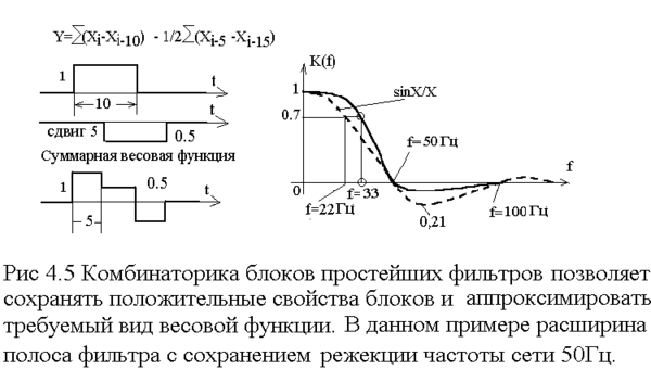 Простейшие цифровые фильтры легко согласуются с работой ЭВМ в реальном времени. Для них на каждое новое поступление выборки данных процедура фильтрации требует буквально единицы команд: например для фильтра с прямоугольным окном надо ввести в сумматор значение новой выборки и вычесть значение запаздывающей N-ой. Число операций не зависит от N. Классический вариант формирования частотного фильтра требует повторять много операций на каждый шаг: перемножить N поступивших выборок на свои весовые коэффициенты и просуммировать результат. Поэтому представляет интерес приближенное формирование желаемых характеристик фильтров комбинаторикой простейших. Например, фильтр с прямоугольным окном можно рассматривать как "строительный кирпич" для ступенчатой аппроксимации желаемого вида отклика фильтра. На рис П.7.7 показана структура комбинаторного фильтра НЧ с расширенной полосой пропускания от 22 до 33Гц. Комбинаторные фильтры сохраняют все свойства "составных кирпичей" с добавлением новых, желаемых. На практике желательно применять фильтры с симметричными весовыми функциями.