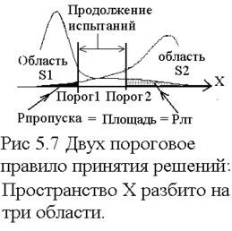 Передвигая порог решающего правила мы уменьшаем значение одной ошибки, но вторая при этом возрастает. Такое нас может не удовлетворять. Как не "оптимизируй" выбором границ распределения ошибок, общая их величина может оказаться недопустимой. Значит необходимы дополнительные обследования, эксперименты, наблюдения. Теория обнаружения с изменяемой продолжительностью экспериментов была создана Вальдом. Он предложил устанавливать не одну, а две границы (два порога) в области принятия решений. Между ними выделяется средняя область. Если при вектор апостериорной реализации un→ попадает в эту среднюю область (т.е. находится между порогами), то решение принимать нельзя, необходимо продолжать испытания (обследование) до тех пор, пока новый вектор un→ не попадет в установленные нами крайние области принятия решений. Сами же пороги принятия решений можно устанавливать задавая сколь угодно малыми величины вероятностей ошибок (рис П.10.2). Однако продолжительность испытаний (обследований) увеличивается и становится случайной величиной. Но по сравнению с процедурой фиксированной длительности обследования (или набора процедур обследования) при тех же значениях заданных допустимых величин ошибок двухпороговое решающее правило приводит к сокращению требуемого времени обследования в среднем в 2-3 раза. В оптимизации структуры последовательности диагностического обследования заложены большие возможности повышения эффективности.