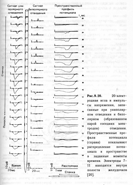 Потенциалы деполяризации желудокв в стенке миокарда, снятые иглой со встроенными по длинне 24мя электродами
