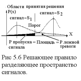 Указание вероятностей событий дает полные основания для принятия решения. Выше мы описали следующее решающее правило (См рис П.10.1): если вектор un→ попал в область, находящуюся правее точки П до бесконечности, то принимаем решение, что сигнал S1 присутствует. Этому решению соответствует вероятность правильного утверждения Р(S1/un) и вероятность ошибочного Р(S2/un). В случае попадания un→ в область, находящуюся левее точки П (Порог) до минус бесконечности- принимаем решение об отсутствии сигнала S1 (присутствует S2) с вероятностью правильного утверждения Р(S2/un) и вероятностью ошибочного Р(S1/un)- пропуск сигнала. Сформированное решающее правило: пространство существования принимаемых реализаций un→ делится на области (устанавливаемые границей П), в каждой области приписывается ее сигнал (у нас S1 или S2). При попадании un→ в область принимается соответствующее решение. Каждому решению соответствуют вероятности правильного и ошибочного решения. В нашем случае это вероятности ложного обнаружения S1 - ложная тревога и пропуска S1. Изменение границ областей изменяют эти вероятности, мы устанавливаем границы с учетом возможных неприятностей (потерь) от ошибок (частоты появления ошибок).