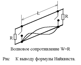 Пусть мы имеем идеальную двухпроводную линию без потерь длиной L и волновым сопротивлением W=R. Эта линия нагружена с двух сторон резисторами величиной R каждое, как показано на рис П.9. Таким образом линия согласована. Если напряжение ЭДС шума каждого резистора e, то каждый резистор отдает в нашу линию (и поглощает из нее) мощность е2/4R. Очевидно эта мощность пробегает (распространяется) вдоль линии W. Одновременно мысленно замкнем линию с двух сторон (замкнем наши сопротивления). Распространявшаяся в ней мощность будет замкнута. Наша линии без потерь и мощность никуда не денется, останется в виде стоячих волн. Таким образом мощность е2/4R равномерно распределится по всем частотам стоячих волн (или по всем степеням свободы колебаний) линии W. На каждую степень свободы придется энергия кТ. Энергия равна произведению мощности на время ее действия. У нашей линии длина L произвольна, она определяет время пробега tп = СL, где С - скорость света. Каждая степень свободы имеет колебания с полосой частот одной моды стоячей волны dF = 1/tп=1/СL). Таким образом мощность на одну степень свободы: kT/tп = кТdF= е2/4R, откуда е2=4кТRΔF. Это и есть формула Найквиста.
