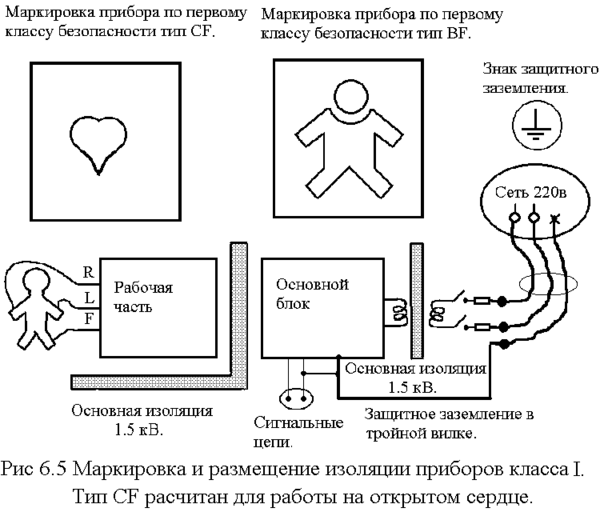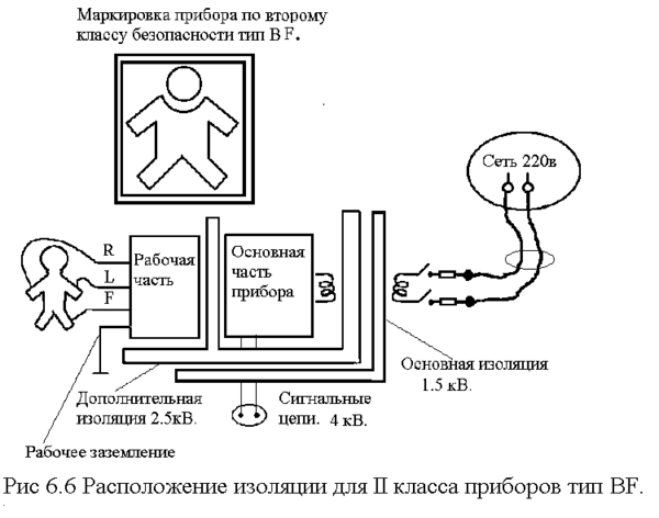 е цепи, соединяемые с электродами. Рабочая часть отделяется от остальных узлов прибора дополнительной изоляцией. Безопасность в целом обеспечивается основной изоляцией, дополнительной изоляцией, (иногда они обьединяются и называются усиленной изоляцией), защитным заземлением и специальными требованиями к питающим трансформаторам.