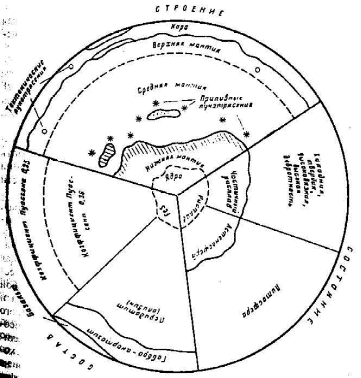 Поверхность Луны покрыта рыхлым грунтом - реголитом, образовавшимся при ударах метеоритов и раздроблении пород. Изучение Луны дало геологам доказательство усиленной метеоритной атаке Земли в этот же интервал времени, 3,9-4,0 млрд. лет назад. Сила тяжести на Луне 1/6 земной и у нее есть очень слабое магнитное поле неизвестного происхождения. На Луне выделяется кора, мощностью до 60 км и скоростью сейсмических волн Vр - 7,0-7,7 км/ сек; литосфера или верхняя и средняя мантия до глубины 1000 км; нижняя мантия (астеносфера), частично расплавленная, как и ядро, с глубины 1500 до 1740 км. Через них не проходят поперечные сейсмические волны.