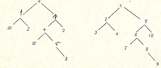 Порядок просмотра носит префиксный характер: каждый символ обрабатывается в той последовательности, в которой он встречается при спуске по дереву сверху вниз и слева направо (в порядке номеров, показанных на правой части рис.1).