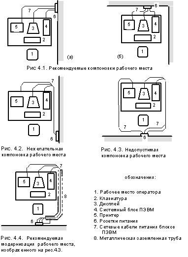 На рисунках 4.1 - 4.4. показаны варианты компоновки рабочего места, рекомендуемые и не рекомендуемые с точки зрения электромагнитной безопасности.