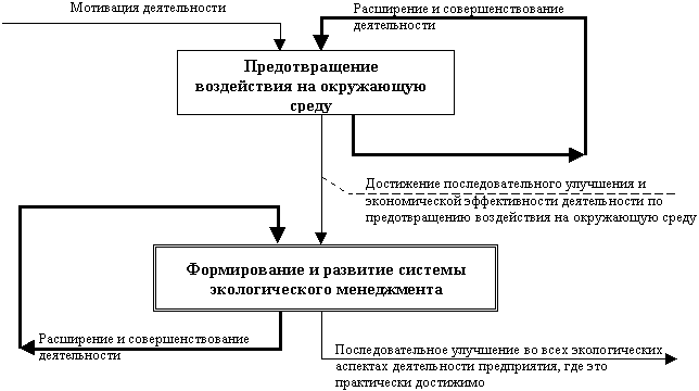 Если предприятие оказывается не в состоянии планировать и развивать деятельность по предотвращению воздействия на окружающую среду в ее основных направлениях, перечисленных выше, то на таком предприятии отсутствуют необходимые условия и предпосылки для эффективного экологического менеджмента отсутствуют. И, напротив, если подобная деятельность систематически поддерживается и развивается предприятием, то имеются все необходимые основания для успешного формирования и быстрого развития системы экологического менеджмента, включая последующее декларирования и сертификацию ее соответствия, например стандарту ISO 14001.