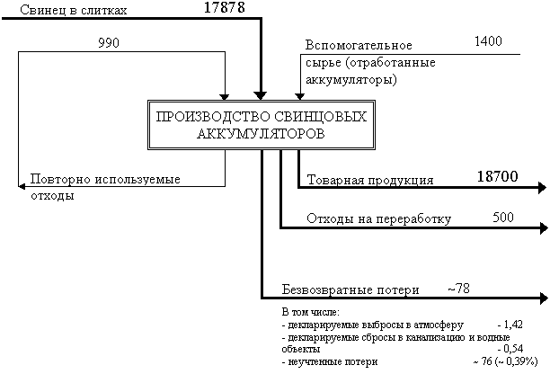 Рис. 3. Обобщенная схема входных и выходных материальных потоков завода по производству свинцовых аккумуляторов (т/год в пересчете на Pb)
