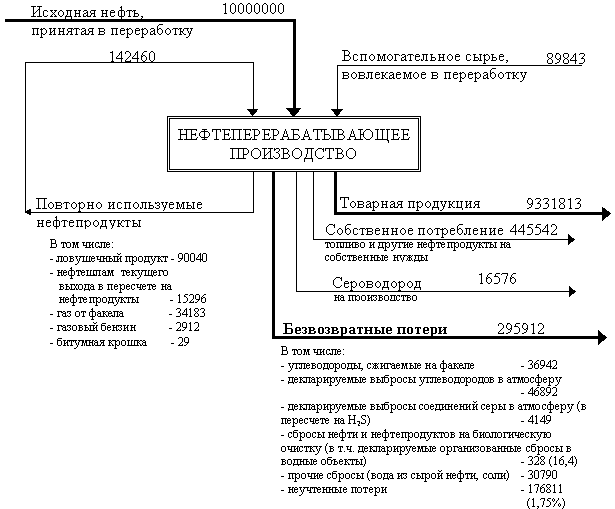 Наглядной иллюстрацией возможных экономических и экологических эффектов, связанных с предотвращение воздействия на окружающую среду могут служить обобщенные схемы входных и выходных материальных потоков различных производств, представленные на рис. 2 и 3. Так, для нефтеперерабатывающего производства неучтенные потери, в первую очередь определяющие фактическое воздействие на окружающую среду, составляют 177 тыс.т (при объеме перерабатываемой нефти 10 млн.т), что в несколько раз превосходит декларируемые в государственной статистической отчетности объемы выбросов и на четыре(!) порядка декларируемые величины сбросов углеводородов. При этом, если не весь объем неучтенных потерь, то большая его часть может оцениваться в качестве непосредственных выбросов и сбросов нефти и нефтепродуктов в окружающую среду. Здесь следует обратить внимание на то, что уменьшение декларируемых сбросов и выбросов практически не сказывается на фактическом воздействии предприятия на окружающую среду. Напротив, любые мероприятия и действия, приводящие к снижению неучтенных потерь, соответственно, снижают и фактическое воздействие на окружающую среду. Реальные технические, технологические и организационные возможности для этого существуют практически по всем вышеперечисленным направлениям предотвращения воздействия на окружающую среду и намного превосходят соответствующие возможности для уменьшения декларируемых выбросов и сбросов загрязняющих веществ. При этом сокращение неучтенных потерь приводит к возрастанию объемов товарной продукции, что делает подобную деятельность экономически высокоэффективной.
