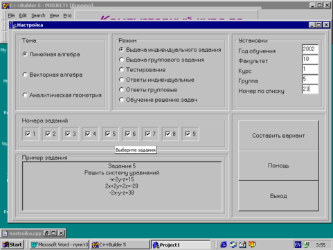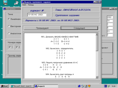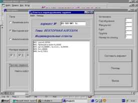 При выборе пункта “Сохранить” – осуществляется сохранение варианта (в случае, если на экране отображен весь вариант) или сохранение одного из заданий(в случае, если на экране отбражено определенное задание) в файл с названием ‘номер факультета-курс-группа номер по списку год обучения.doc’ (к примеру: 08-105 5 2001г.doc)