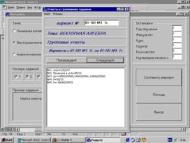 В окне выдачи группового задания реализован просмотр выбранных заданий полным вариантом. При загрузке данного режима в окне появляется первый вариант из списка выбранных. Для просмотра остальных вариантов рекомендуется пользоваться кнопками < Предыдущий > и < Следующий >. При нажатии кнопки < Следующий > на экране отображается следующий вариант из списка выбранных, а при нажатии кнопки < Предыдущий > предыдущий. Вариант можно: