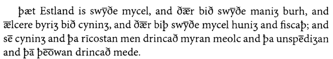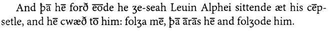 Þa̅ sto̅d him sum mon æt Þurh swefn ond hine ha̅lette ond ʒre̅tte ond hine be his noman nemnde: “Сædmon sinʒ me̅ hwæt-hwuʒu!” Þa̅ ondswarende he̅ ond cweð: “Ne con ic no̅ht sinʒan; ond ic for-Þon of Þe̅ossum ʒebe̅orscipe u̅t e̅o̅de ond hider ʒewa̅t for-Þon ic na̅ht sinʒan ne cu̅ðe!” Eft he̅ cwæð, se̅ ðe wið hine sprecende wæs: “ Hwæðre Þu̅ meaht sinʒan.” Þā cwæð he̅: “Hwæt sceal ic sinʒan?”