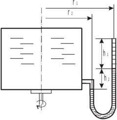 Найти наименьшее давление в воде, заполняющей сосуд, по показанию ртутного манометра, вращающегося вместе с сосудом, если