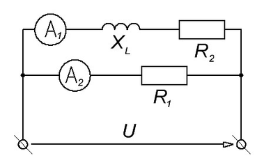 | 5 | Определить показания электромагнитных амперметров А1 и А2, если к цепи подведено напряжение U = 60 В, R1 = 10 Ом R2 = 6 Ом XL = 8 Ом | 1. I1 = 6 А I2 = 4,3 А | |