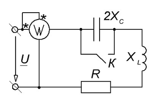 | 2 | Определить показания ваттметра для двух положений ключа 1 – ключ разомкнут, 2 – ключ замкнут, если: U = 180 В, XL = XC = R = 30 Ом. | 1. | ||