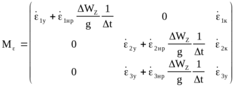 С течением времени полета ориентация гироплатформы будет все больше отличаться от начального. Источником ошибок в ориентации ГСП помимо не идеальности начальной выставки, является прецессия гироскопов, зависящая от времени полета ЛА и от перегрузок, возникающих в течении полета, и приводящая к . Уход гиростабилизированной платформы, вызванных угловым дрейфом можно описать при помощи следующей матрицы: