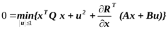 Схема решения. Напомним, что функция будущих потерь представляет собой минимальное значение критерия, которое будет достигнуто системой при движении из текущего состояния. Поскольку в данном случае рассматривается управление на бесконечном интервале времени, а критерий оптимальности описывается квадратичной зависимостью, можно считать оптимальным такое управление, которое обеспечит значение критерия равное нулю. То есть, можно искать оптимальное управление из условия