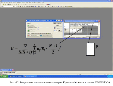 На рис. 4.2 приведена компоновка экранов пакета STATISTICA, обеспечивающих вызов критерия Краскела-Уоллиса и представление результатов.