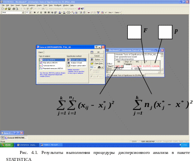 Предварительный анализ с использованием критерия согласия Колмогорова-Смирнова подтвердил соответствие распределения значений бокового промаха нормальному закону распределения, что указывает на необходимость использования метода дисперсионного анализа для ответа на поставленный вопрос. На рис. 4.1 приведена компоновка экранов пакета STATISTICA, обеспечивающих вызов процедуры дисперсионного анализа и представление результатов.