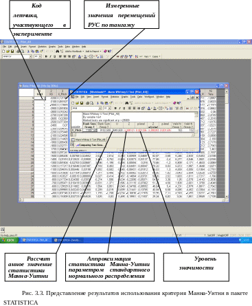 Рассмотрим представление результатов выполнения критерия Манна-Уитни в пакете STATISTICA. Целью статистического исследования являлась оценка индивидуальных различий в манере пилотирования двух летчиков, обладающих одинаковой летной квалификацией. В процессе экспериментального исследования два летчика на пилотажном стенде многократно выполняли режим посадки. В процессе пилотирования в фиксированных точках траектории посадки регистрировались управляющие реакции каждого из летчиков на основе измерения значений перемещений ручки управления самолетом (РУС) по тангажу. Таким образом, объектом статистического исследования являются две независимые выборки значений, объединяющие значения перемещений РУС. Цель статистического исследования заключалась в подтверждении того факта, что летчикам присуща индивидуальная манера пилотирования («почерк»). В математической постановке задача формулировалась как оценка различий между двумя независимыми выборками.