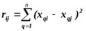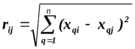 1. Евклидово расстояние, определяемое как расстояние между двумя точками (объектами) в пространстве значений признаков. Применительно к рассматриваемой структуре представления данных наблюдений, расстояние rij между объектами i,j определяется следующим образом: