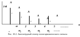 Амплитудный спектр полигармонического сигнала, представляющего собой сумму гармонических сигналов с кратными частотами