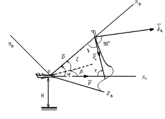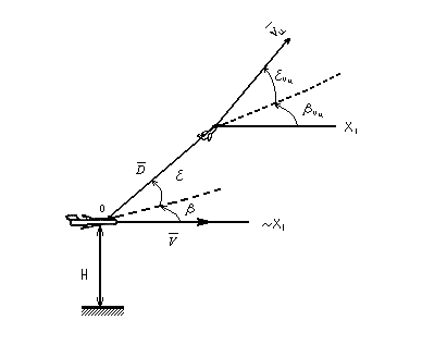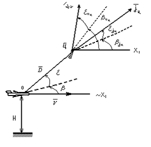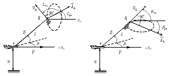 Положение цели в системе координат, связанной с ЛА, определяется дальностью D, бортовым углом цели β и углом места цели ε (при условии совмещения визирной линии с целью). Направление вектора скорости целей №1-4 определяется углами βVц и εVц. Для упрощения расчета дополнительных параметров условий стрельбы для цели №5 считаем, что противник совершает маневр по кривой погони, т.е.