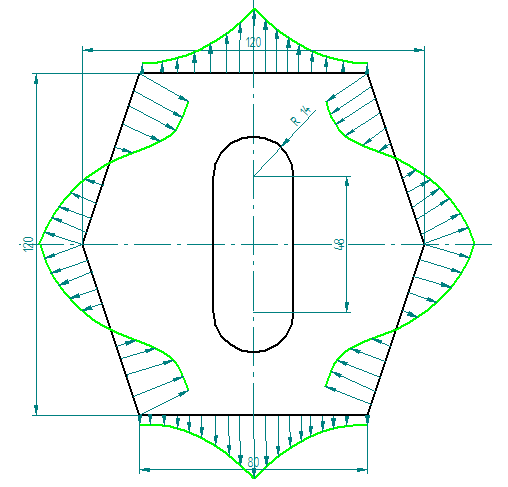 q1 = (q0-s)^(1.5)(Cos(0.05s)), где q0 – варьируемый параметр равный 150, координата s отсчитывается от точки максимальной ширины пластины вдоль наклонной стороны до конца наклонной стороны и изменяется от 0 до 63.25.