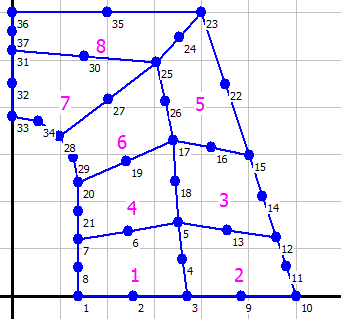 При построении приближенной модели пластины, разбиваем её на восемь восьмиузловых областей: узел 15 соответствует точке изменения знака функции нагрузки.