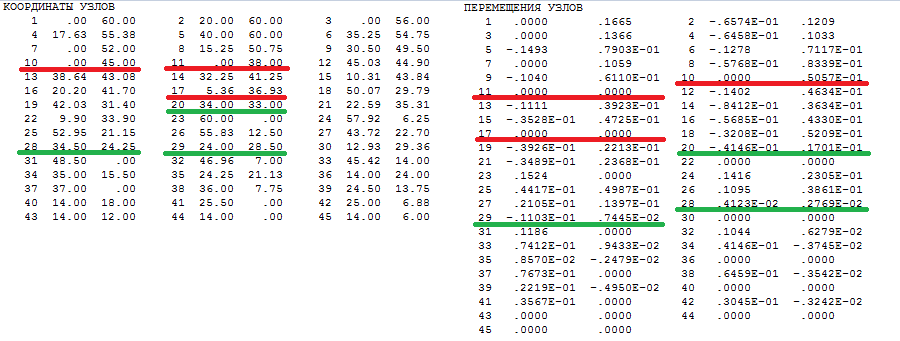 Результаты расчета перемещений из текстового результата расчета для узлов выбранных элементов. Элемент 28 (узлы 20,28,29) и элемент 50 (узлы 10,11,17):