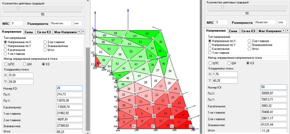 При NRC=3 рассмотрим элемент №28, к узлам которого не приложена нагрузка, и узлы которого не закреплены, а также элемент №50, с узлами, закрепленными по x и по y: