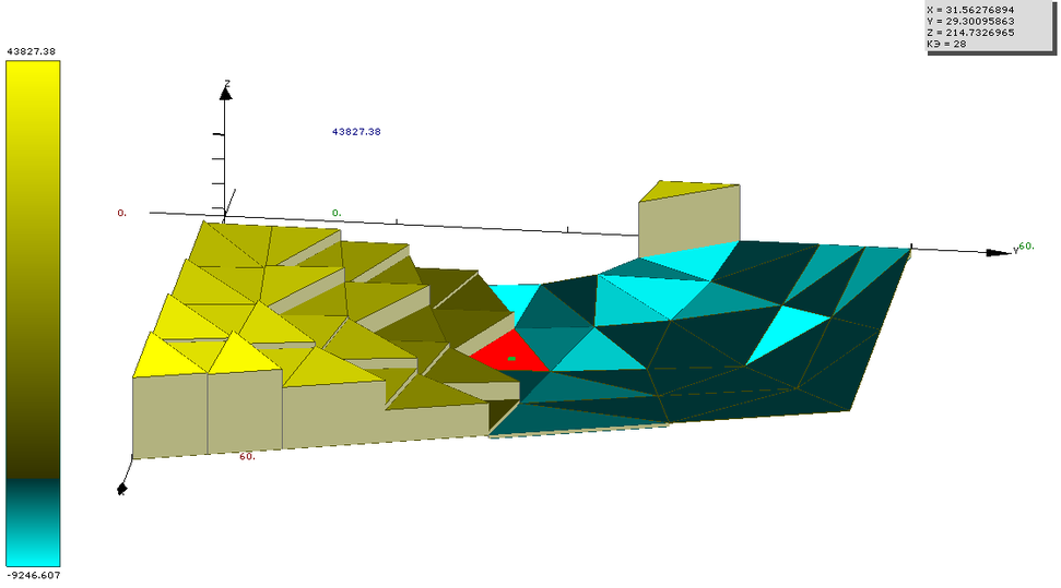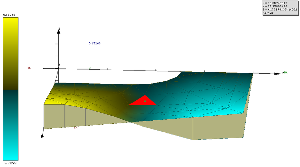 Демонстрация в 3D из постпроцессора в одном из выбранных КЭ одного из перемещений и одного из напряжений.