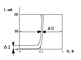 Зарисовать на миллиметровке ВАХ в диапазоне токов от 0 до 20 мА. Центральная горизонтальная шкала экрана с мелкими делениями соответствует току I1=10 мА. По ней произведите отсчет напряжения U1. Ручкой управления вертикальным отклонением луча сместить изображение вверх на два деления (4 мА), зарисовать на той же миллиметровке смещенную ВАХ, и по центральной горизонтальной линии измерить изменение напряжения U. Рассчитать дифференциальное сопротивление p-n перехода: