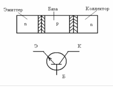 Биполярный транзистор содержит три полупроводниковые области с чередующимися типами проводимости (p – n – p или n – p – n), которые называются соответственно эмиттером, базой и коллектором. Эти области разделены двумя взаимодействующими между собой p-n переходами: эмиттерным и коллекторным. Взаимодействие между переходами обеспечивается благодаря тому, что расстояние между ними (толщина базы) много меньше диффузионной длины неосновных носителей в базе. К полупроводниковым областям созданы омические контакты и внешние выводы. Принцип действия транзисторов типа p – n – p и n – p – n одинаков. В работе рассматриваются только транзисторы типа n – p – n.