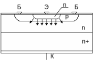 В биполярном транзисторе физические процессы определяются движением носителей заряда обоих знаков, что и отражено в его названии. На рисунке 1 приведены сечение (а), схематическое (б) и схемотехническое изображение биполярного транзистора.