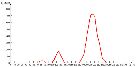 - снять зависимость мощности колебаний, генерируемых клистроном, от напряжения на ускоряющем электроде PК=f(U0) (при UОТР=const).