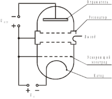 В отличие от пролетного клистрона отражательный клистрон имеет один резонатор, который одновременно модулирует поток электронов, летящих от катода к отражателю, и отбирает энергию от отраженных электронов.