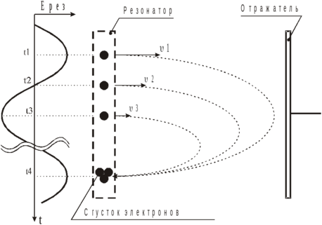 Группировка происходит относительно невозмущенных электронов (пролетевших через резонатор в момент t2 на рисунке 3, когда в нем Eрез = 0). Электрон, вышедший раньше (t1 на рисунке 3) и имеющий большую скорость, проникает в тормозящее поле отражателя глубже, следовательно, летит дольше невозмущенного и может вернуться в зазор резонатора почти одновременно вместе с ним. Электрон, вышедший позже невозмущенного электрона (t3 на рисунке 3) и имеющий меньшую скорость, проникает в тормозящее поле на меньшее расстояние, и велика вероятность, что он вернется в резонатор вместе с невозмущенным электроном.