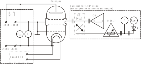 - волновод (на рисунке 4 изображен сплошной линией соединяющей все элементы схемы справа от клистрона);