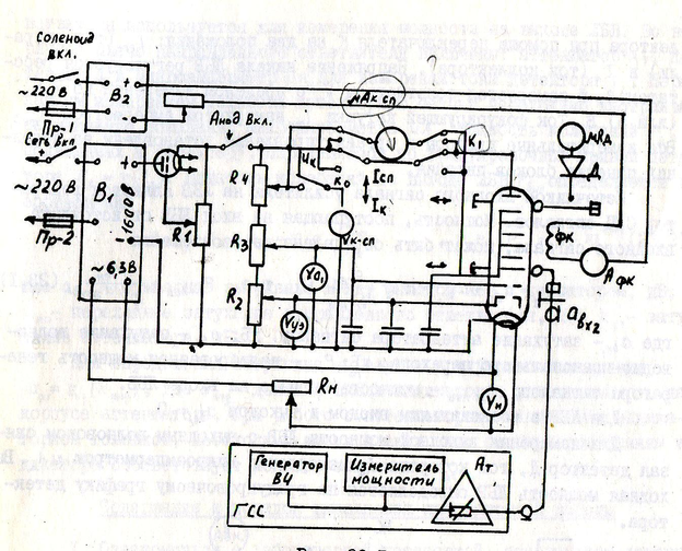 На выходе стабилизированного выпрямителя В1, дающего выпрямленное напряжение около 600 В, включен делитель напряжения (резисторы R2 – R3 – R4). с которого снимаются необходимые для питания электродов ЛБВ напряжения. Напряжение на делителе R2 – R3 – R4 устанавливается первоначальной регулировкой стабилизатора при помощи регулируемого резистора R1. Все напряжение, снимаемое с делителя, подается на коллектор ЛБВ и измеряется вольтметром VК-СП с пределом измерений 500 В. Этим же вольтметром может быть измерено напряжение на спирали. Для этого служит тумблер К2, имеющий два положения: UСП( напряжение на спирали) и UК (напряжение на коллекторе). Напряжение на спирали UСП регулируется потенциометром R4. Напряжение на первом аноде UА1 регулируется потенциометром R3 и измеряется вольтметром VА1 с пределом измерений до 100 В. Для измерения напряжения на управляющем электроде UУЭ служит вольтметр VУЭ с пределом измерений до 25 В. Напряжение на управляющем электроде регулируется потенциометром R2. Ток спирали IСП и ток коллектора IК измеряются микроамперметром мкАК-СП с пределом измерений до 500 мкА. Микроамперметр мкАК-СП может быть включен в цепь спирали или коллектора при помощи переключателя К1 на два положения: IСП (ток спирали) и IК (ток коллектора). Напряжение накала ЛБВ регулируется реостатом RН и измеряется вольтметром VН с пределом измерений до 7,5 В. Ток фокусирующей катушки IФК измеряется амперметром АФК. Все измерительные приборы и органы управления установлены на передней панели блока питания.
